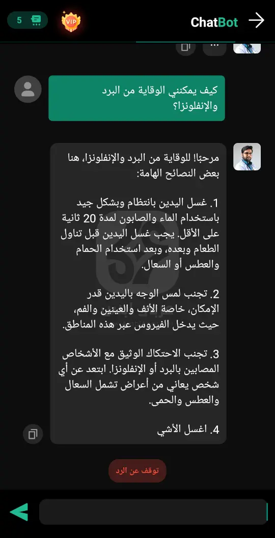 - اكتب الرسالة الأولى وفورًا سيتم الرد عليك من قبل الذكاء الاصطناعي بنفس الطريقة هنا.