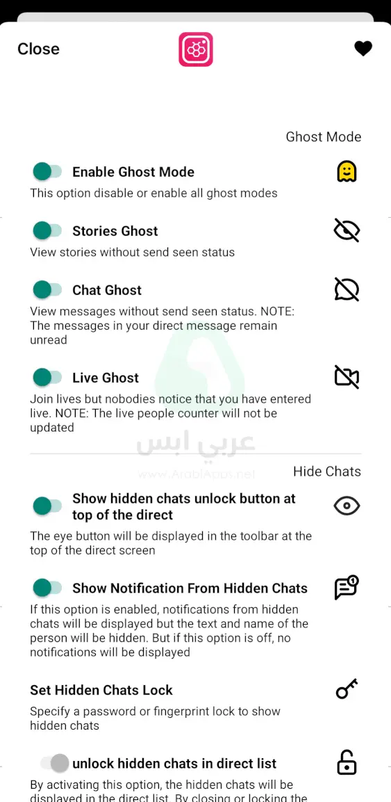 - وضع الشبح: عند استخدام هذا الوضع سوف تتمكن من استخدام التطبيق في أي وقت والتمتع بكل الخدمات التي يوفرها في وضع متخفي تماماً ودون أن يعرف أي أحد من الأصدقاء أنك متصل.
