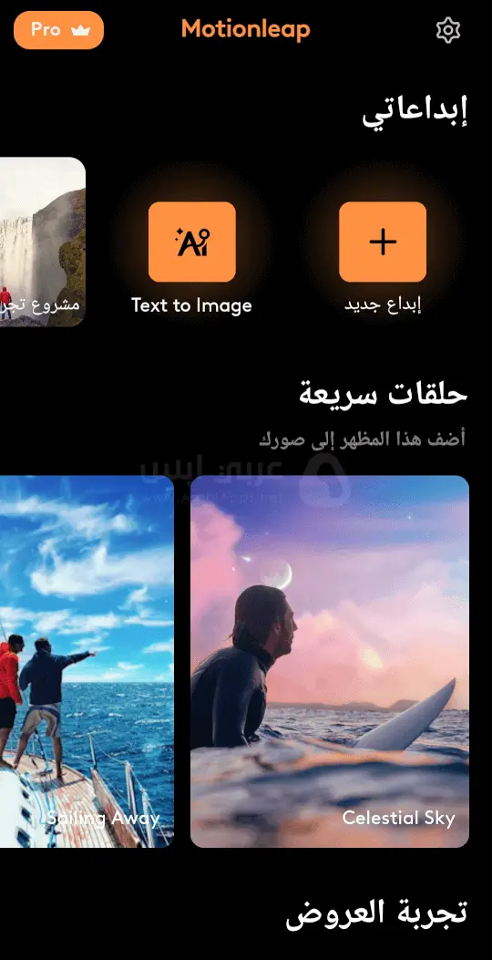 - بعد الانتهاء من تنزيل برنامج تحريك الصور 2025 على جهازك والانتقال إلى الواجهة الرئيسية عليك بالنقر على زر (إبداع جديد) من الأعلى بعد إعطاء الأذن بالوصول إلى كل الوسائط.